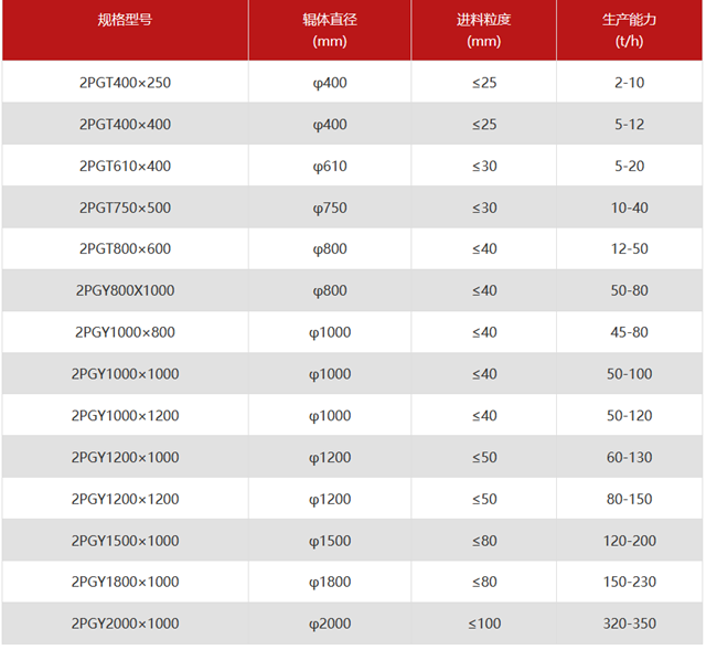沙頭料對輥制砂機規(guī)格型號參考表如下: