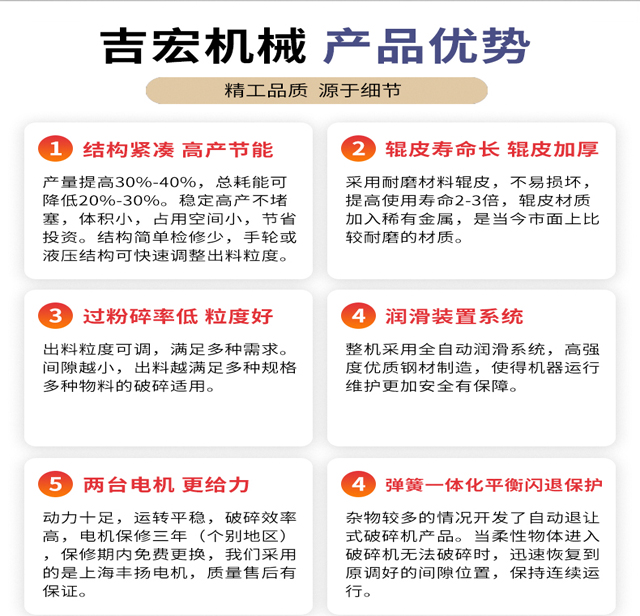 對輥式破碎機將破碎物料經(jīng)給料口落入兩輥子之間,進行擠壓破碎,成品物料自然落下。遇有過硬或不可破碎物時,對輥式破碎機的輥子可憑液壓缸或彈簧的作用自動退讓,使輥子間隙增大,過硬或不可破碎物落下,從而保護機器不受損壞。相向轉(zhuǎn)動的兩輥子有一定的間隙,改變間隙,即可控制產(chǎn)品最大排料粒度。